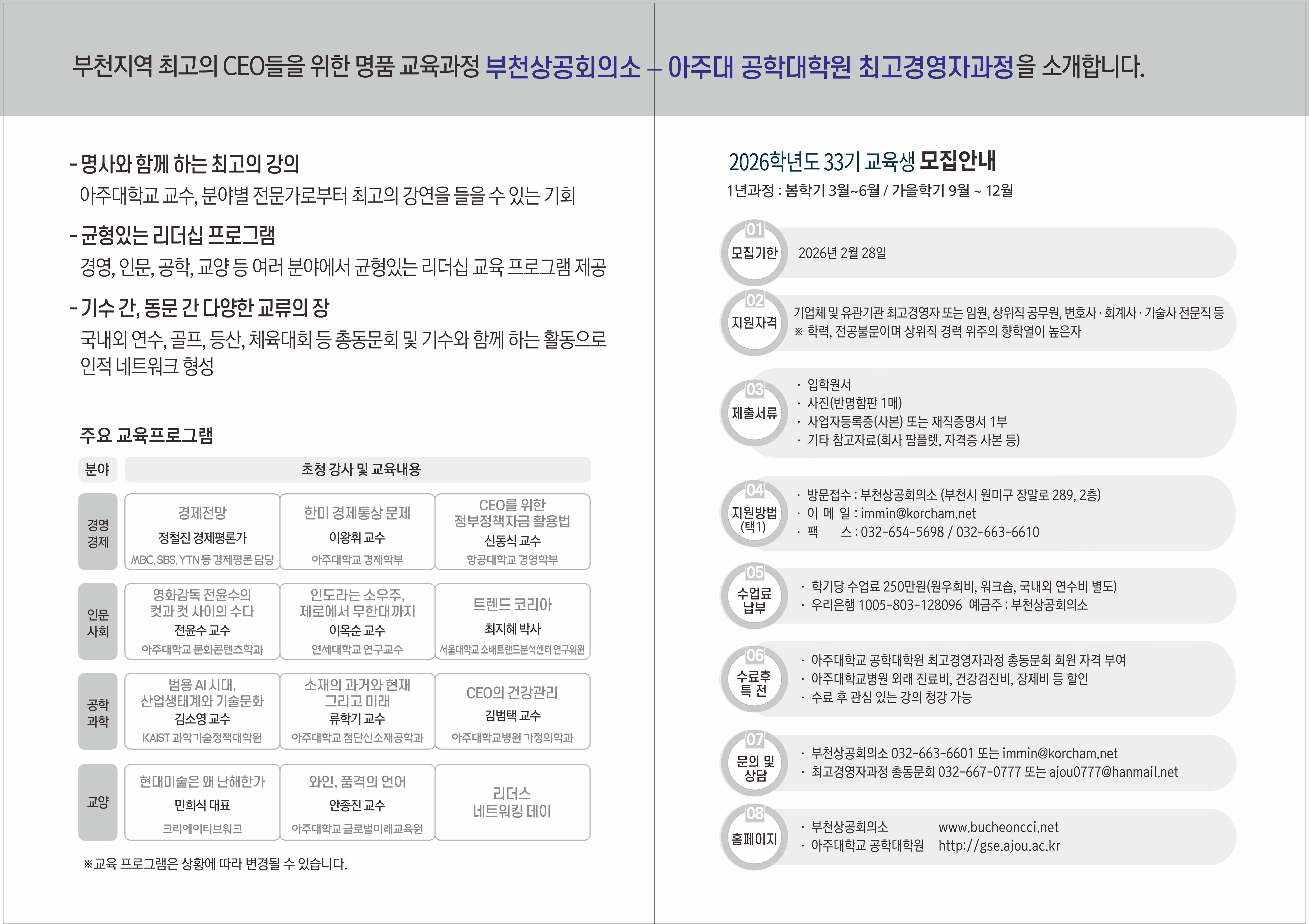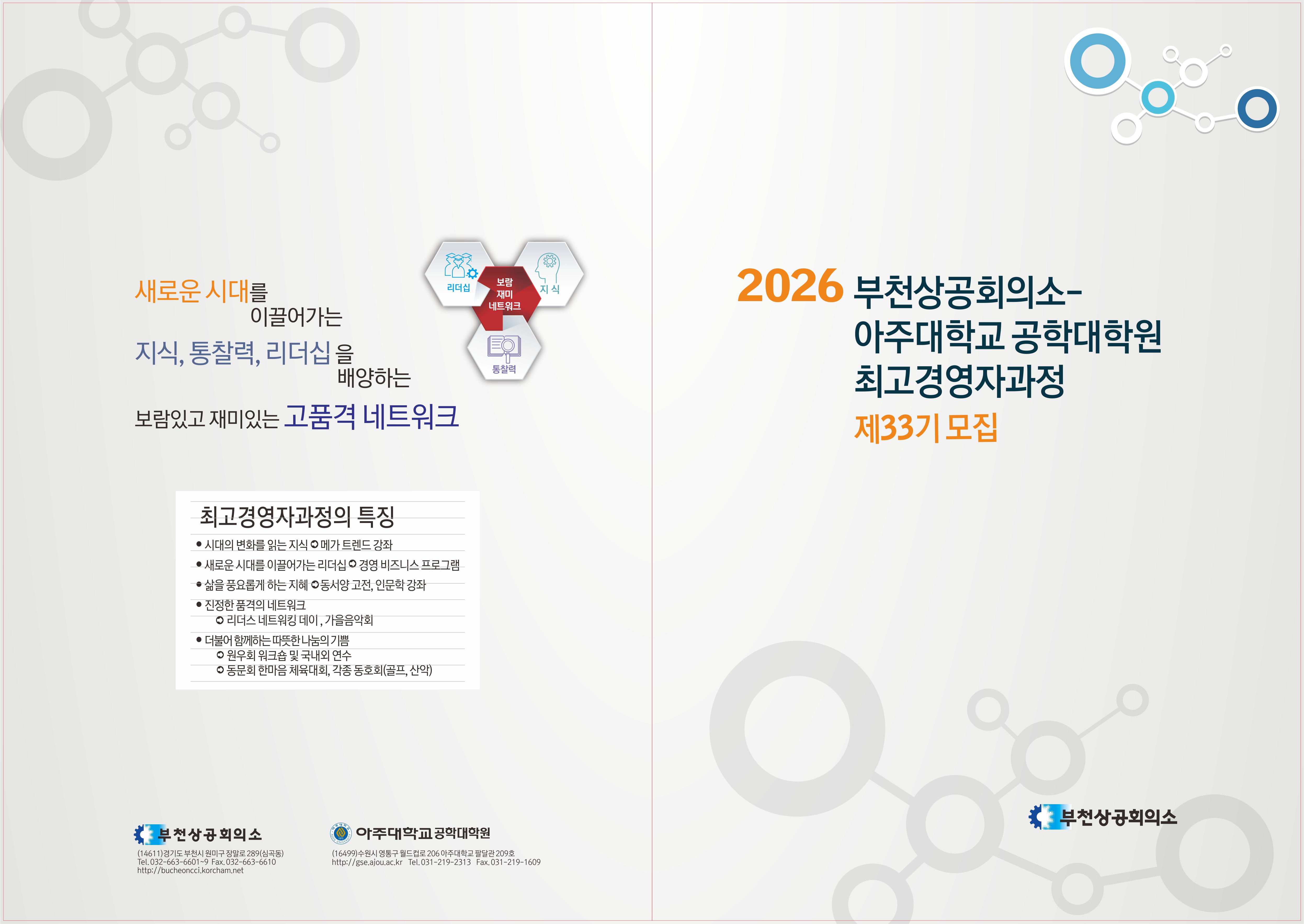 부천상공회의소-아주대 공학대학원 최고경영자과정 33기 교육생을 아래와 같이 모집합니다. 많은 관심과 참여를 바랍니다.