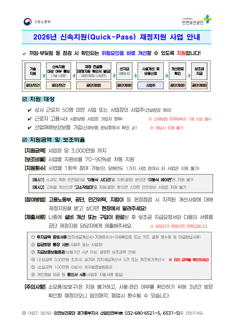 | ‒ | [안전보건공단 중부지사] 2026년 신속지원(Quick-Pass) 재정지원 사업 안내 |