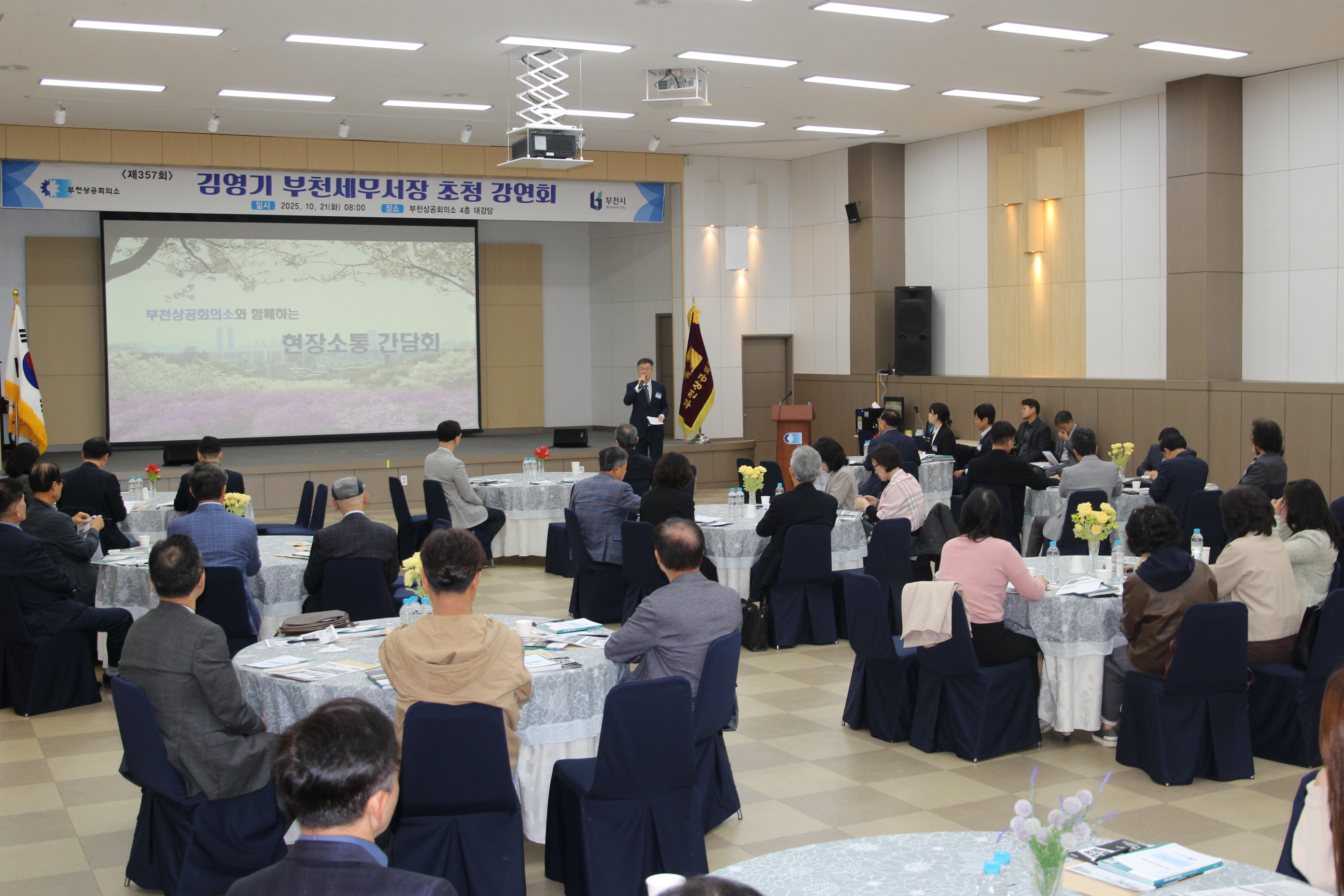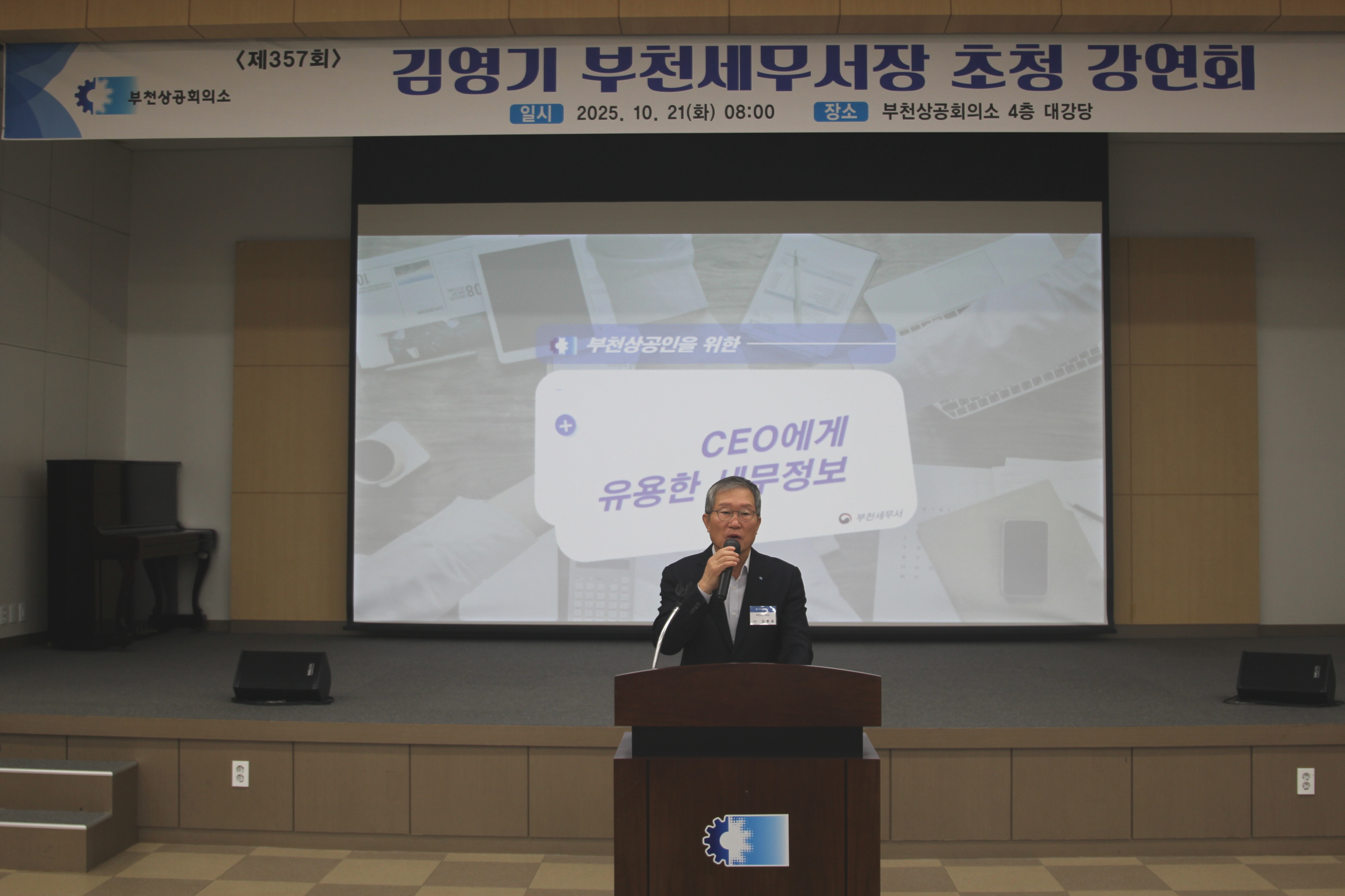 부천상공회의소(회장 김종흠)는 10월 21일 오전 8시, 부천상공회의소 4층 대강당에서 『김영기 부천세무서 서장 초청 제357회 강연회』를 개최했다.